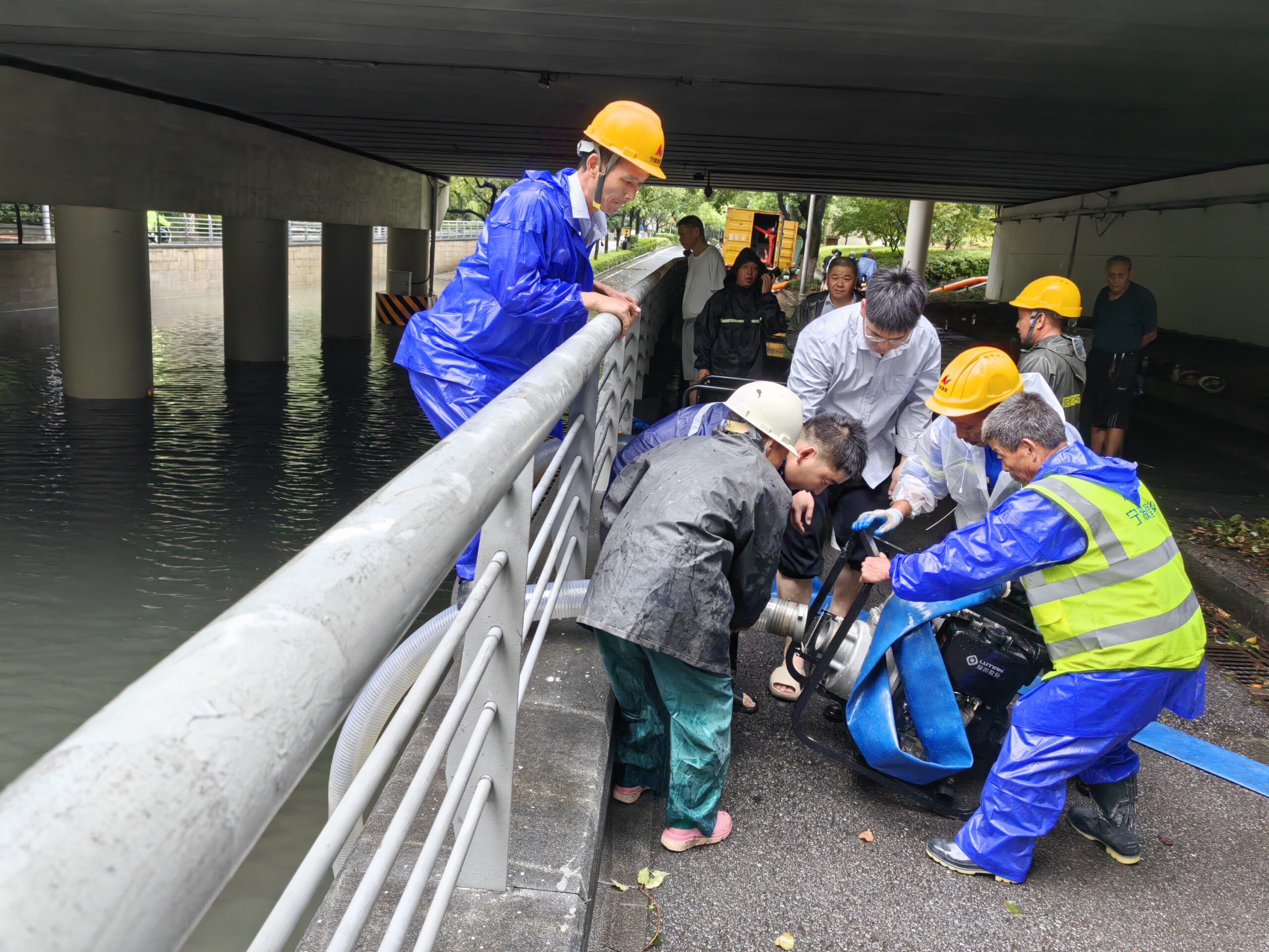 ? ? ? ?受今年8號臺風(fēng)竹節(jié)草影響,寧波城市部分路段積水嚴(yán)重,早上8點左右,寧波建設(shè)集團應(yīng)急救援隊組織20余名搶險隊員,攜帶3臺排水泵赴琴橋下橋洞處進行強排作業(yè),此時橋洞積水已經(jīng)近2米深,有多部行經(jīng)車輛涉水被淹,搶險隊員立刻組織排水工作,經(jīng)過近6個小時的作業(yè),截止下午2點,橋洞積水已基本排干。隨后,救援隊又馬不停蹄前往秀水街改造項目進行排水。
