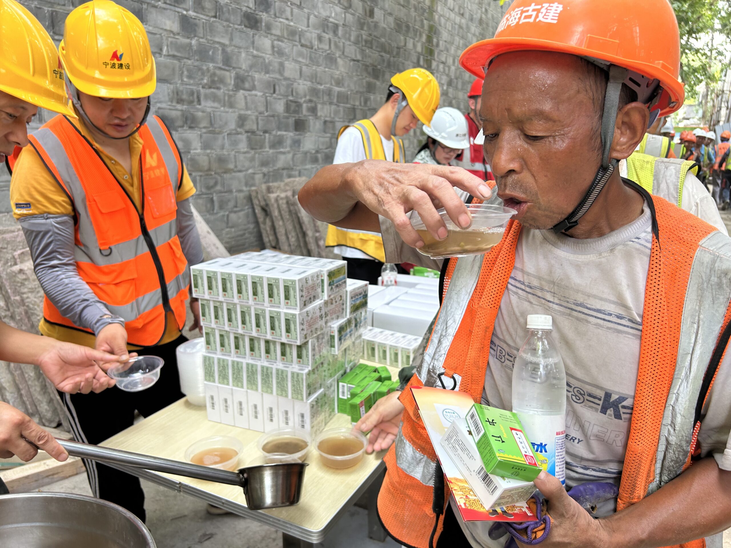 ? ? ? ?海曙區(qū)秀水街歷史文化街區(qū)改造項(xiàng)目,正在搶抓工期,現(xiàn)場有超過600余名工人頂著烈日堅(jiān)守崗位。為保障現(xiàn)場施工人員身心健康,項(xiàng)目部配備了充足的防暑降溫藥品,提供綠豆湯等清涼飲,并多次在休息時(shí)間開展送清涼慰問,向現(xiàn)場作業(yè)人員發(fā)放防暑降溫藥品和安全提醒手冊,提醒工人務(wù)必注意高溫下的防暑降溫工作,預(yù)防“熱射病”等情況的出現(xiàn)。